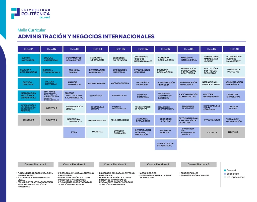 - Desde los primeros ciclos estudiarás gestión empresarial, comercio exterior, economía, finanzas, marketing y planeamiento estratégico. Desarrollarás competencias en análisis, liderazgo y toma de decisiones, aprendiendo a gestionar organizaciones y mercados globales.