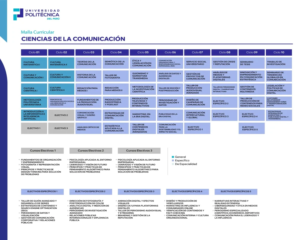 - Desde los primeros ciclos estudiarás redacción, fotografía, medios digitales, comunicación institucional, periodismo, publicidad y relaciones públicas. Desarrollarás pensamiento crítico, sensibilidad social y dominio de herramientas tecnológicas para comunicar con creatividad y responsabilidad.