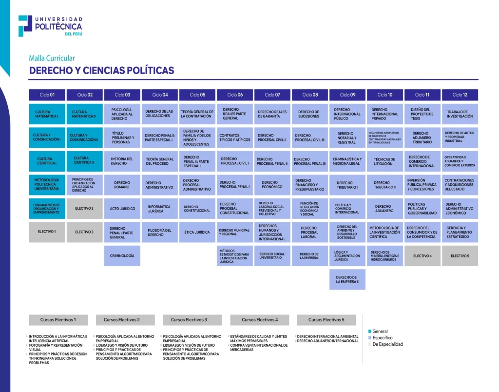 - Desde los primeros ciclos aprenderás fundamentos de derecho constitucional, civil, penal, administrativo y comercial, además de análisis político, ética pública y oratoria jurídica. Desarrollarás pensamiento crítico, capacidad argumentativa y compromiso con el bien común.