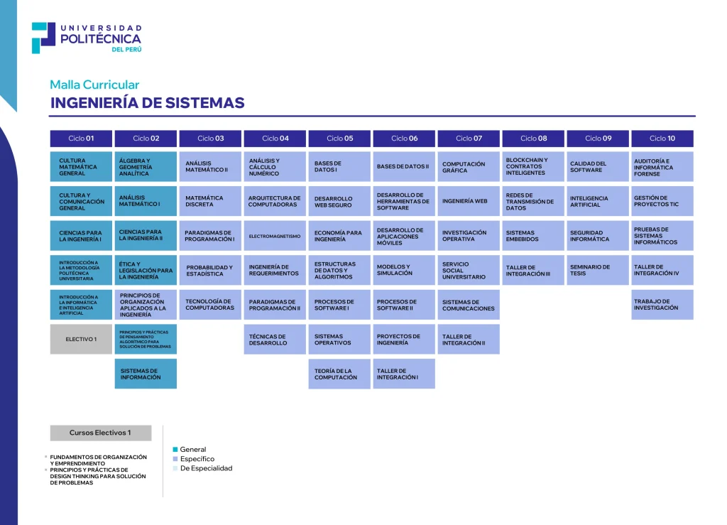- Desde los primeros ciclos aprenderás programación, bases de datos, redes, algoritmos, ciberseguridad, inteligencia artificial y gestión de proyectos tecnológicos. Desarrollarás pensamiento analítico, creatividad y capacidad para liderar proyectos digitales con impacto en empresas, instituciones y emprendimientos.